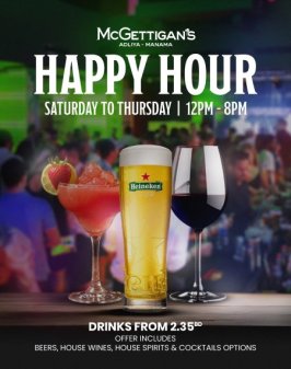 Join us for an unbeatable Happy Hour every week from Saturday through Thursday at McGettigan's Adliya Bahrain!