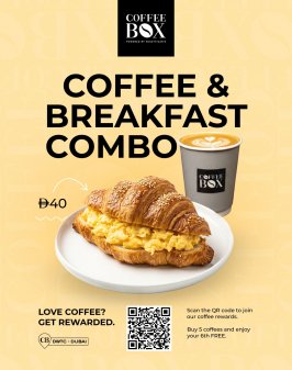 Start your morning right with our Coffee & Breakfast Combo — a freshly brewed coffee paired with a warm, flaky croissant filled with fluffy scrambled eggs, made to fuel your day the delicious way.