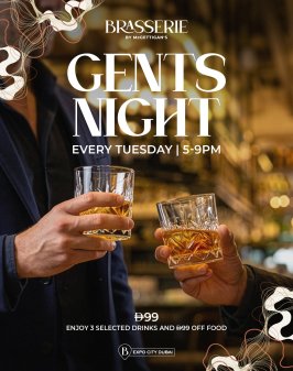 Join us every Tuesday at Brasserie by McGettigan’s for Gents’ Night, where refined drinks meet relaxed midweek indulgence. Enjoy three selected drinks for AED 99, along with AED 99 off food, in an elegant brasserie setting at Expo City Dubai.