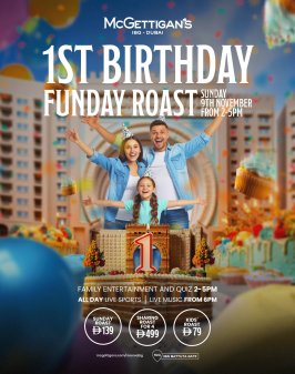 Celebrate McGettigan’s Ibn Battuta Gate’s 1st Birthday with a special Funday Roast, packed with birthday fun for the whole family!
