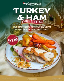 From 10th November, tuck into our hearty Traditional Roast Turkey & Ham at McGettigan's Ibn Battuta Gate for AED 139.