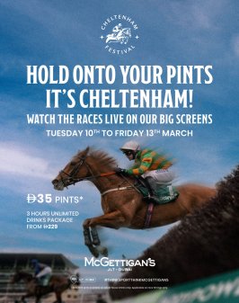 Hold onto your pints — the Cheltenham Festival is back! Join us at McGettigan’s JLT as we bring you four thrilling days of worldclass horse racing live on our big screens.