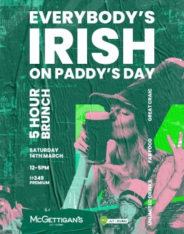 Everybody’s Irish with McGettigan’s, so join the festivities with a 5-hour premium brunch from 12PM and make a proper day of it. Expect a buzzing atmosphere from start to finish as we celebrate the luck of the Irish.