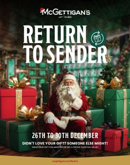 Got a Christmas gift that didn’t quite make your nice list? Bring it along to McGettigan’s JLT from Friday, 26th December to Tuesday, 30th December for our Return to Sender gift swap!