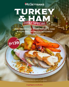 From 17th November, tuck into our hearty Traditional Roast Turkey & Ham at McGettigan's JLT & Souk Madinat for AED 139.