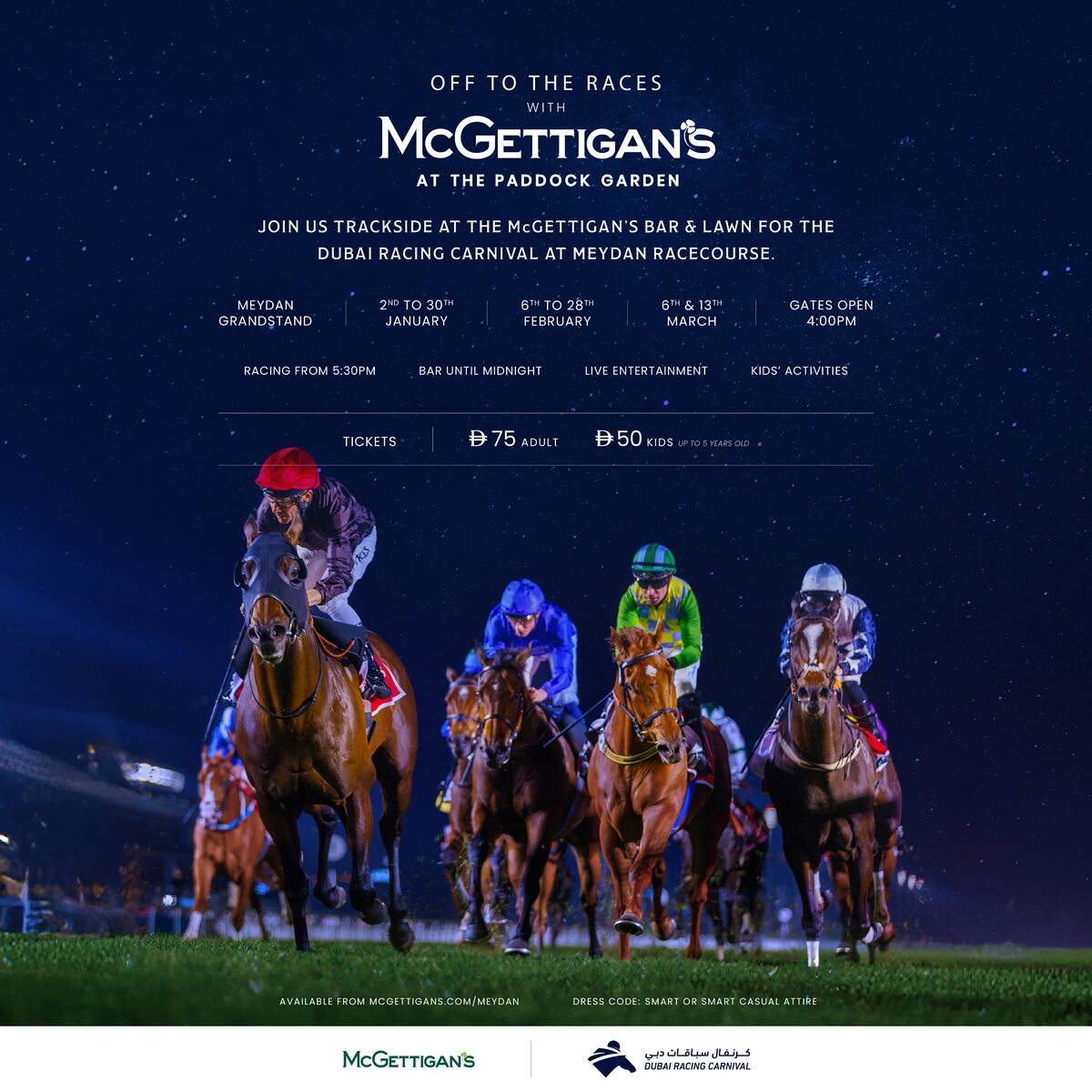 Experience the thrill of racing at Meydan with McGettigan's at the Paddock Garden.