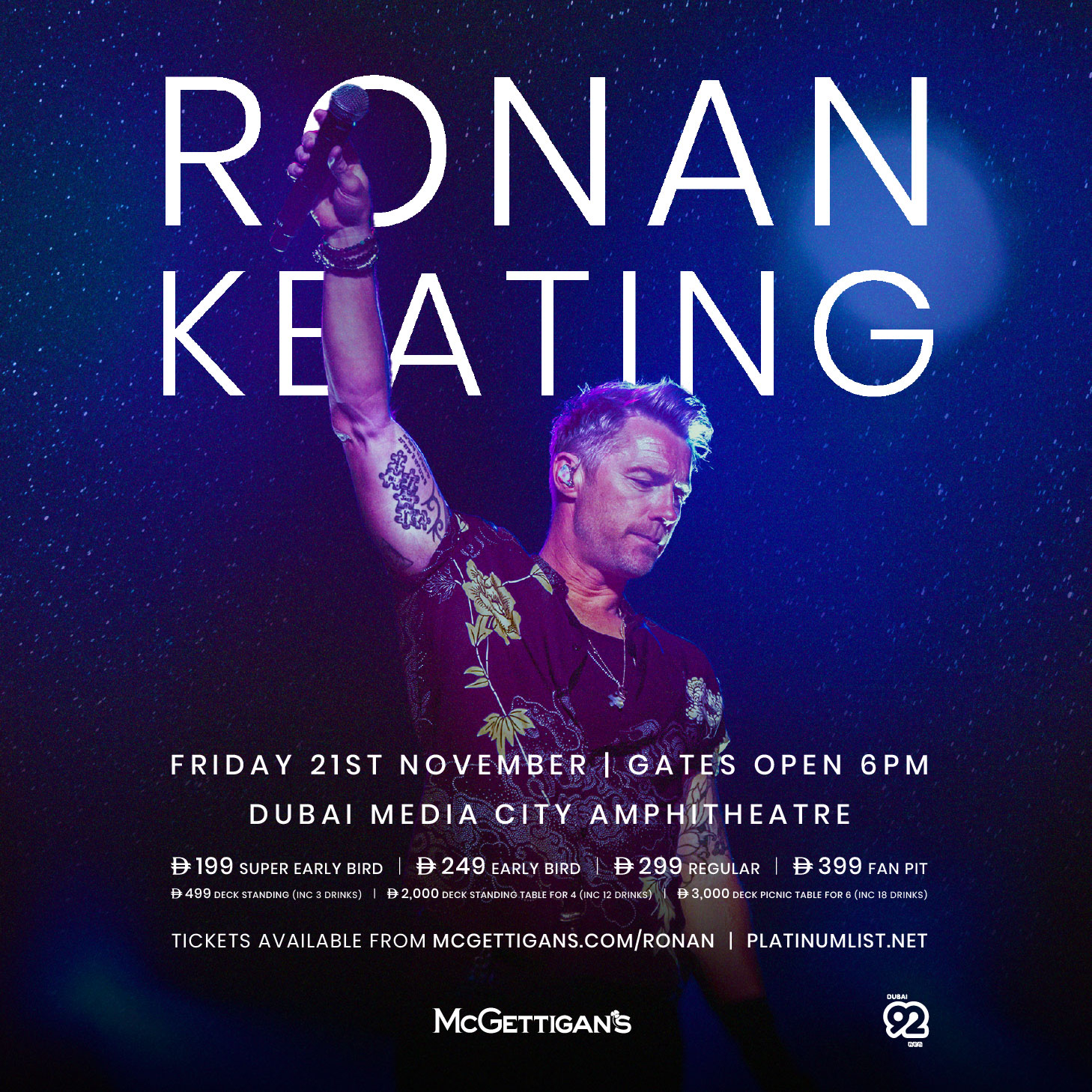 Global pop music icon Ronan Keating and his band take centre stage at Dubai Media City Amphitheatre on Friday 21st November, for an unforgettable night of timeless hits and feel-good favourites at the city’s favourite concert venue.