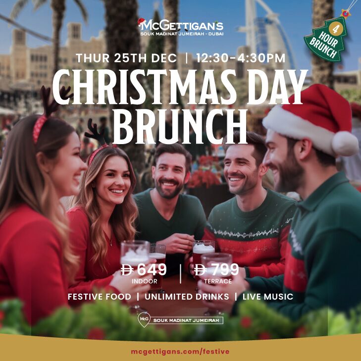 Celebrate Christmas Day at McGettigan's most sought-after festive brunch, set in the heart of Souk Madinat Jumeirah – a location famed for its magical Christmas market, stunning canal views, and Burj Al Arab backdrop.