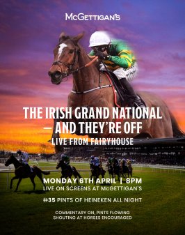 Saddle up for the Irish Grand National at McGettigan’s. Join us on Monday, 6th April to catch all the action live on screens, with full commentary, great atmosphere, and pints flowing. Expect big races, big reactions, and plenty of shouting at the horses—just the way it should be.